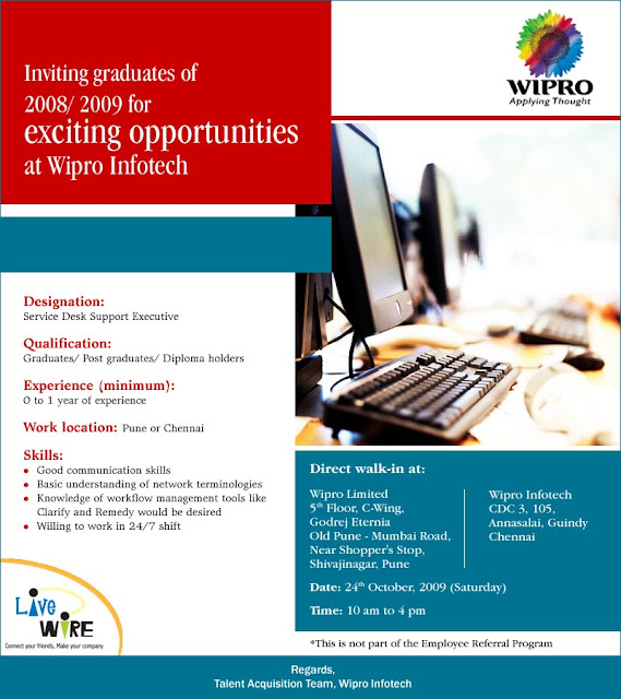 The eligible candidates can directly walkin for the selection process on Saturday, Oct 24th, 2009.